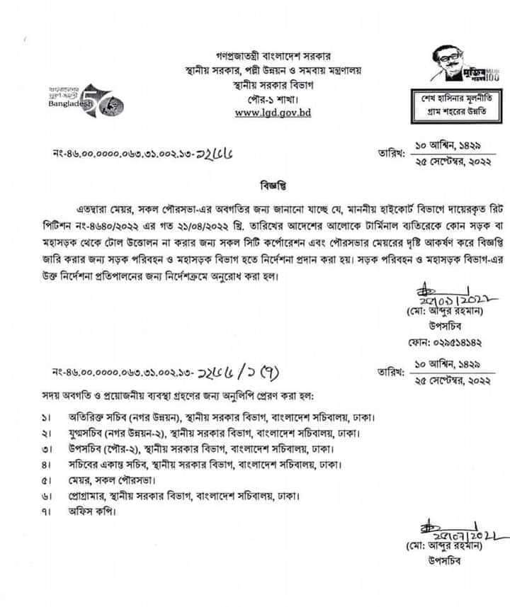 হাইকোর্টের নির্দেশনা অমান্য করে সড়ক ও মহাসড়কে আদায় করা হচ্ছে পৌর টোল।